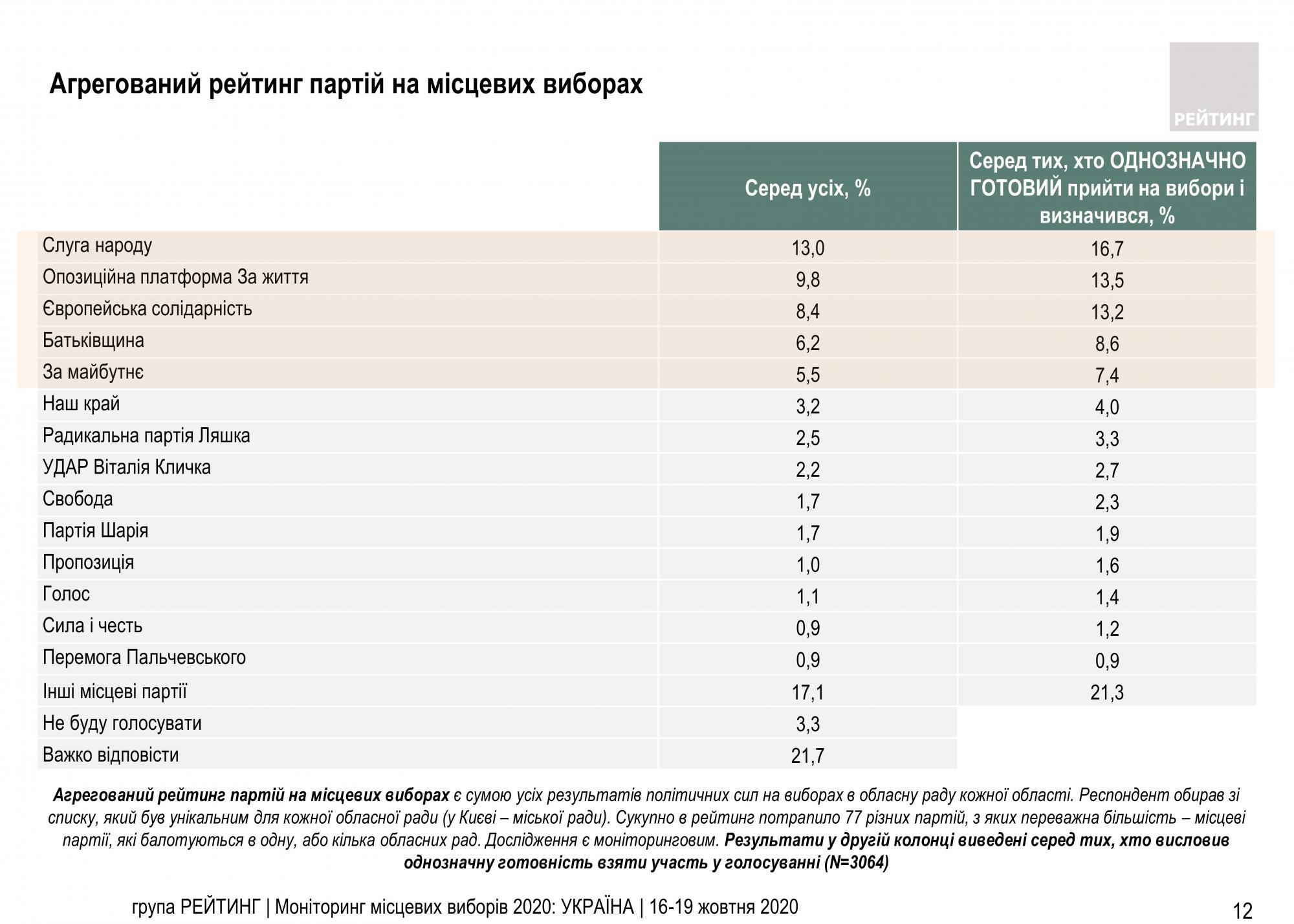 Суммарный рейтинг других партий (в основном местных), которые принимают участие в местных выборах и были включены в список для исследования, – 21,3%.