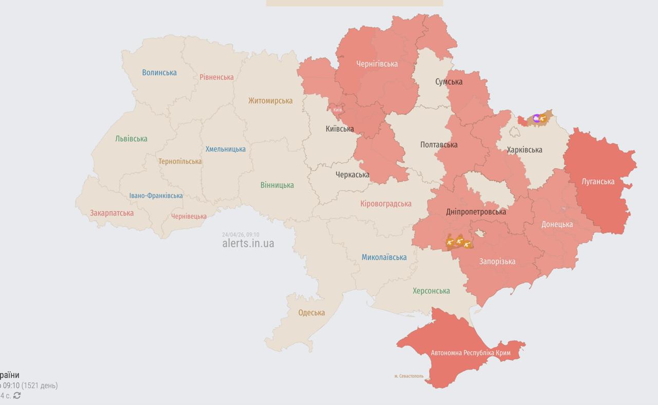 По состоянию на 09:30 24 апреля воздушная тревога объявлена в Киеве и части Киевской области, а также в Черниговской, Запорожской и Донецкой областях.