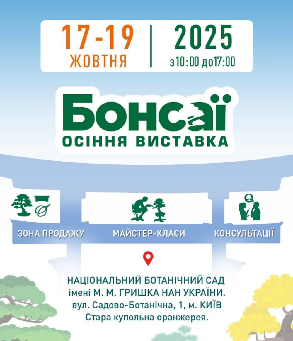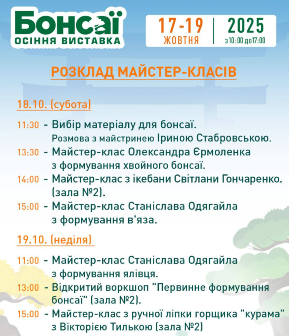 - Майстер-класи. Для відвідувачів проводитимуть майстер-класи з догляду та створення дерев у стилі бонсай.
