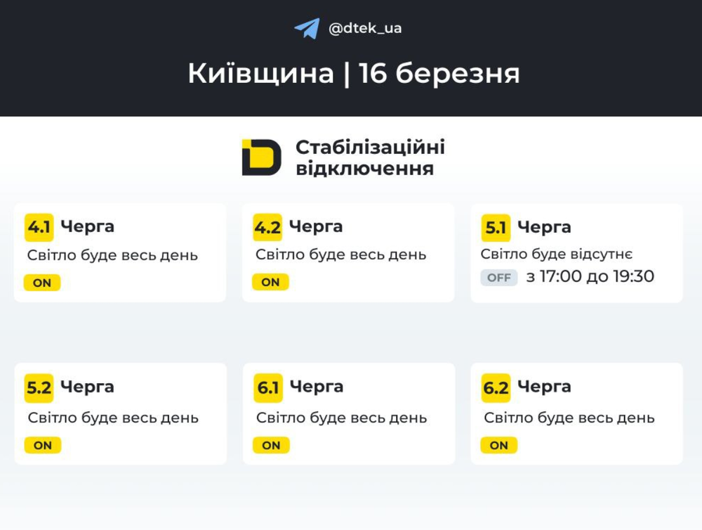 "У разі змін, будемо оперативно вас інформувати у нашому телеграм-каналі. Підписуйтесь та поділіться, будь ласка, з родичами та друзями", – повідомляє ДТЕК.
