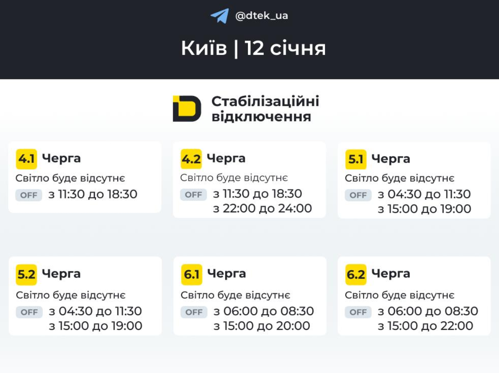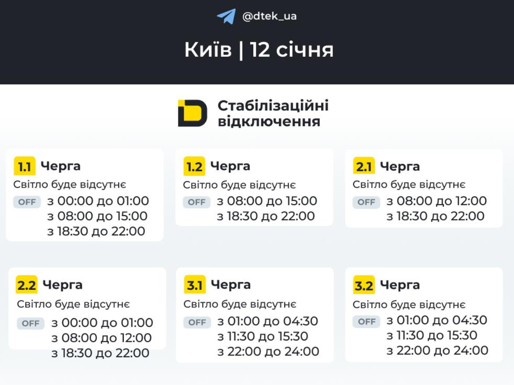 Сьогодні, 12 січня, в Києві діють стабілізовані та екстрені відключення електропостачання. Про це повідомляє ДТЕК.