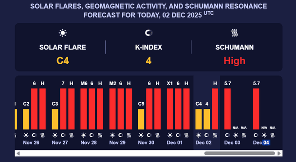 У середу, 3 грудня 2025 року, активність Сонця зросте, а в Україні очікується магнітна буря червоного рівня. За даними meteoagent та Британської геологічної геологічної служби, К-індекс прогнозується на рівні 5,7, що може впливати на самопочуття метеозалежних людей.