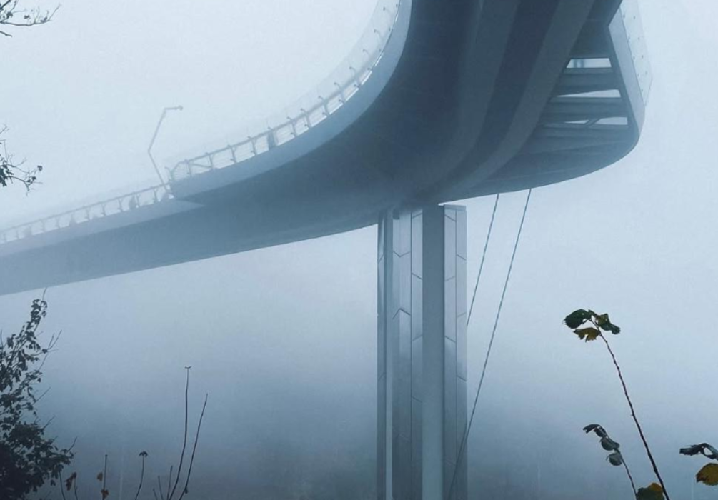 Пішохідний міст накрили сірі хмари. Складається враження, що він немов "завис" у повітрі.