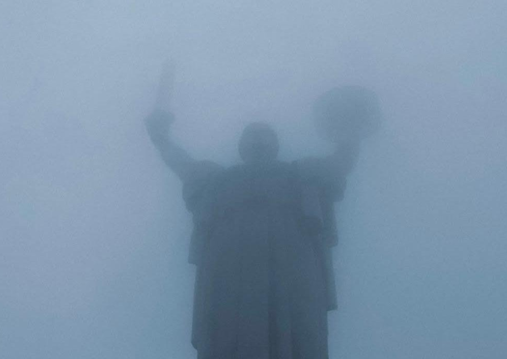 Через погану видимість монумент "Батьківщина-Мати" зливається із темрявою, стаючи майже непомітним здалеку.
