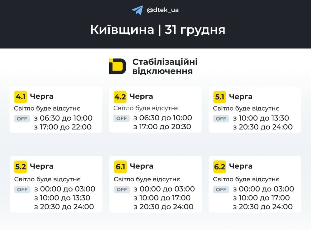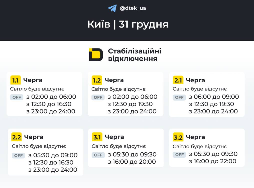 У середу, 31 грудня, в Києві та області діятимуть стабілізаційні і екстрені відключення світла. Про це повідомляє ДТЕК.