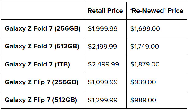 Samsung розширила програму відновлених смартфонів Re-Newed і додала до неї Fold 7 та Flip 7. Пристрої проходять ремонт, отримують нову батарею та офіційне відновлення від виробника.