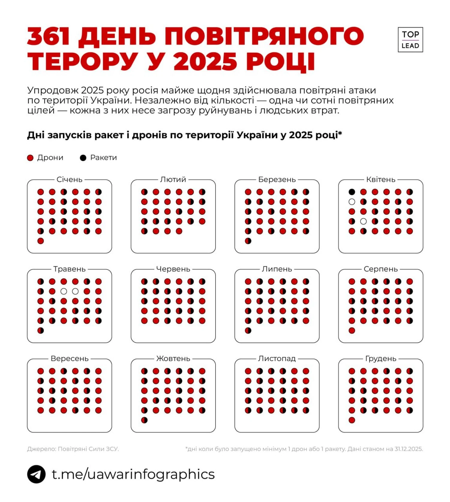 Протягом усього 2025 року Україна всього 4 дні не піддавалася атакам ракетами та "шахедами", пише УНН з посиланням на UA War Infographics.