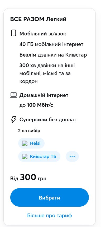 Оператор Киевстар предлагает базовый тариф "Все вместе Легкий" стоимостью около 300 грн/месяц (либо 220 грн при переходе). Включены безлимитные звонки внутри сети, 40 ГБ интернета, 300 минут на другие сети и 200 SMS.
