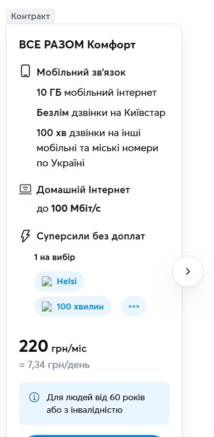 Для возрастных абонентов предусмотрен тариф "Все вместе Комфорт" – примерно 220 грн/месяц. Он включает безлимит внутри сети, 100 минут на другие операторы, 10 ГБ интернета и доступ к сервису Киевстар ТВ. Пользователи могут также добавить дополнительную услугу "суперсила" по выбору.