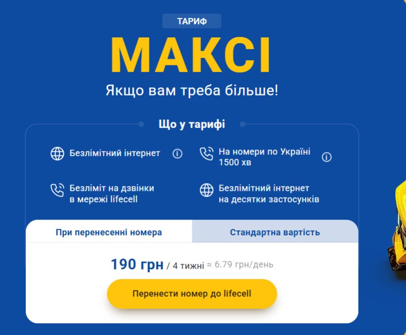 В линейке lifecell самым доступным предложением является тарифный план "Макси". Его цена – около 300 грн/месяц, но для абонентов, переходящих с другого оператора, возможна скидка до 190 грн. Условия включают безлимитные звонки внутри сети, 25 ГБ интернета и 750 минут на другие сети. Для активных пользователей доступен тариф "Мега" – примерно 500 грн/месяц (или около 350 грн при переходе) с безлимитным интернетом и 1000 минутами звонков.