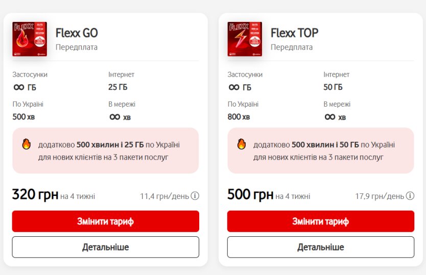 Vodafone предлагает тариф Flexx GO за 320 грн/месяц (или 200 грн при переходе). В него входят 25 ГБ интернета, безлимит в приложениях и 500 минут звонков по Украине. Более премиальный тариф Flexx TOP стоит примерно 500 грн/месяц (или около 350 грн при переходе) и даёт 50 ГБ интернета и 800 минут по стране. Контрактным клиентам доступны тарифы ULTRA (700 грн), ULTRA VIP (1500 грн) и Device 4G (1800 грн).